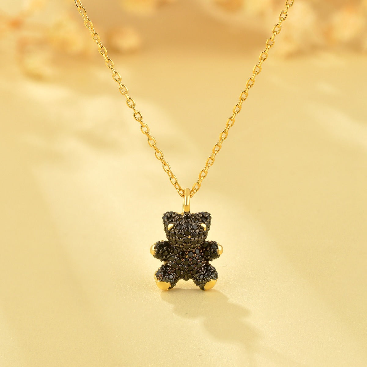Un toque de ternura lujosa y brillante. Este collar de oso en plata 925 y baño de oro de 14K, repleto de detalles con diamantes sintéticos, es el accesorio perfecto para almas dulces con gusto sofisticado.